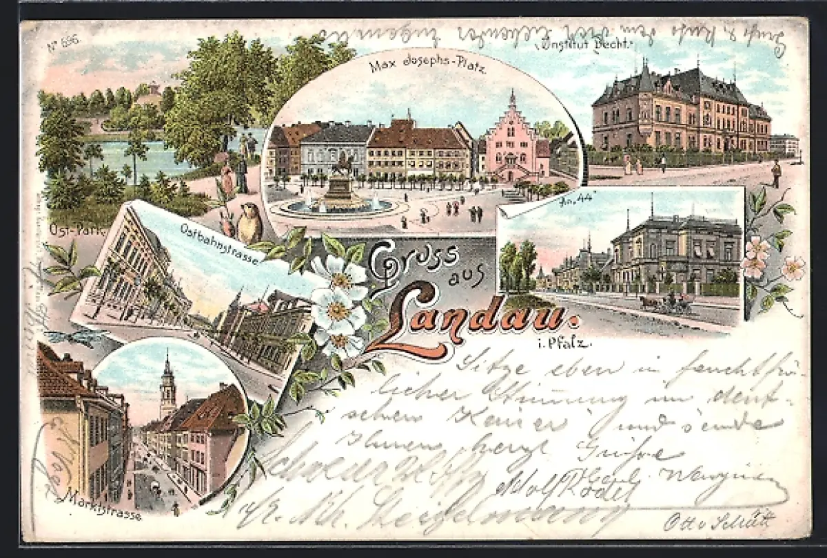 Lithographie Landau, i. Pfalz, Ostbahnstrasse, Marktstrasse, Institut-Becht