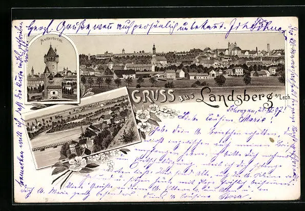 Lithographie Landsberg a. Lech, Teilansicht, Mutterturm, Uferpartie