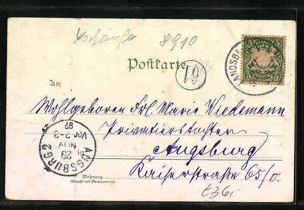 gelaufen 1897, vorderseitig Klebe- und Papierreste, guter Zustand