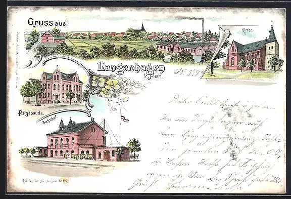 Lithographie Langenhagen i. Han., Bahnhof, Postgebäude, Kirche und Totalansicht