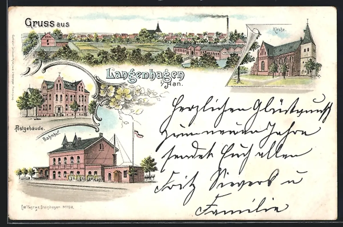 Lithographie Langenhagen i. Han., Bahnhof, Postgeböude, Kirche