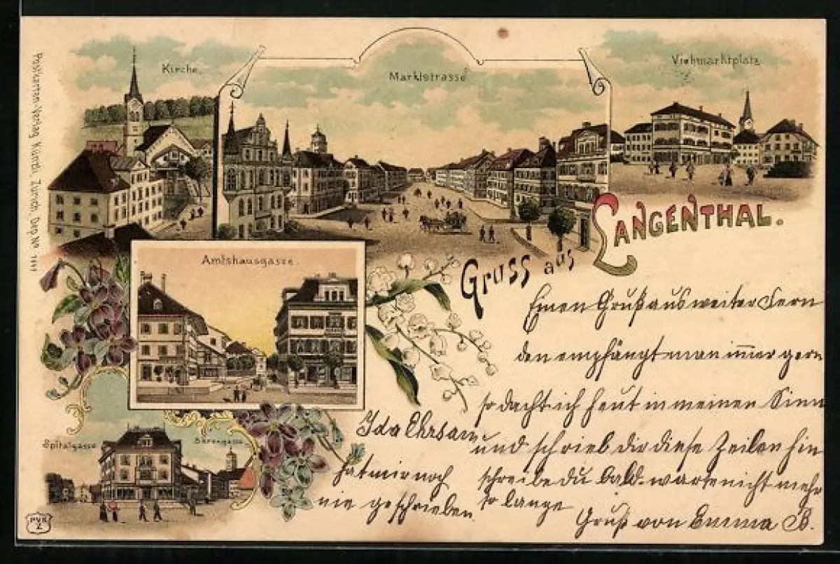 Lithographie Langenthal, Amtshausgasse, Bärengasse und Spitalgasse, Marktstrasse