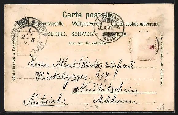 gelaufen 1901, Briefmarke entfernt, rückseitig Oberflächenschaden, guter Zustand