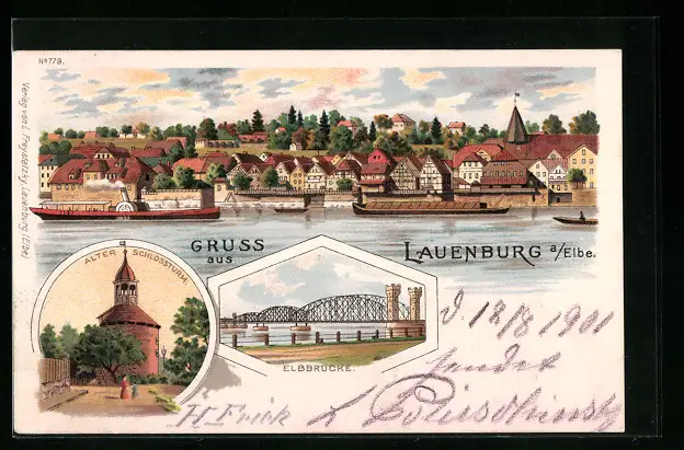 Lithographie Lauenburg a. Elbe, Elbbrücke, Fluss mit Dampfer, Alter Schlossturm