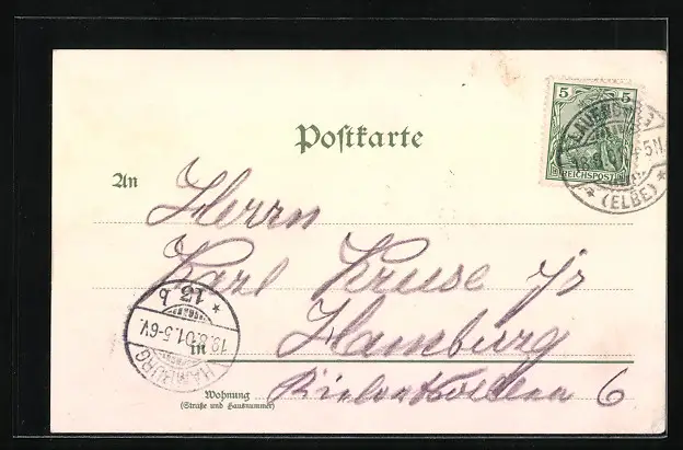 Personenbezogene Daten auf der Rückseite der Karte wurden durch blauen Textmarker unkenntlich gemacht. Die blauen Stellen sind auf die Vorderseite durchgeweicht und wirken sich negativ auf das Postkartenfoto aus