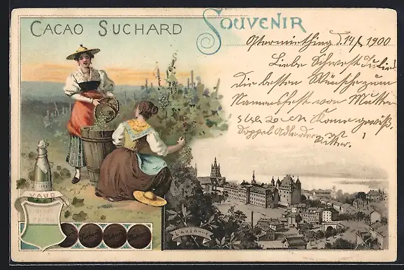 Lithographie Lausanne, Mädchen bei der Weinernte, Cacao Suchard, Wappen Vaud, Ortsansicht