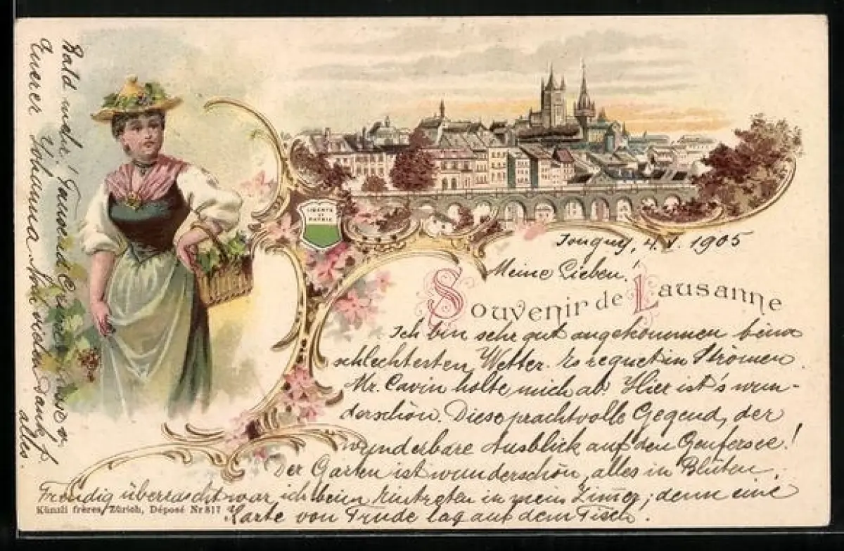 Lithographie Lausanne, Teilansicht, Frau in Tracht
