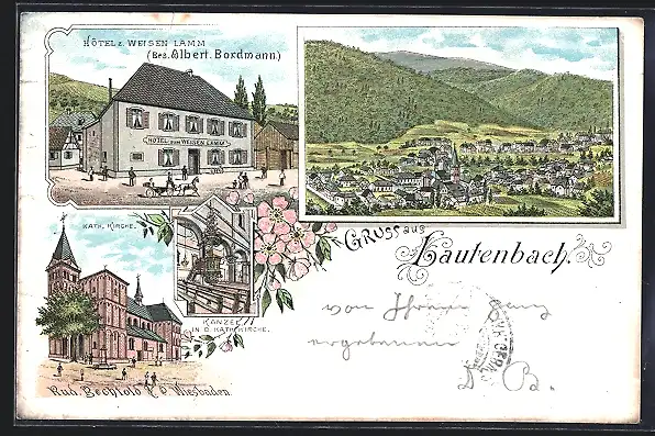 Lithographie Lautenbach, Hotel zum weissen Lamm, Kath. Kirche, Totalansicht
