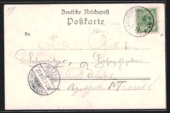 gelaufen 1897, Eckknicke li. unten und re. oben, Einriss li. oben, Bugspur oben li., guter Zustand