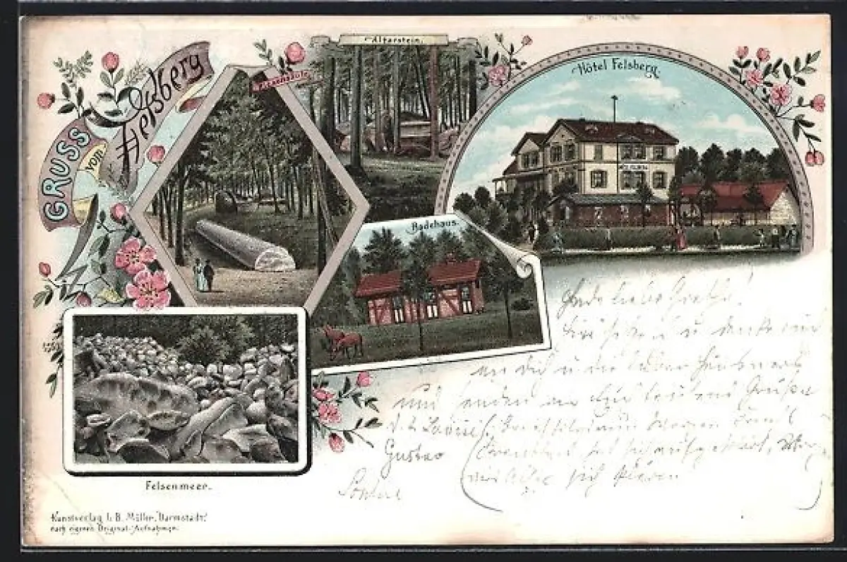 Lithographie Lautertal / Odenwald, Felsberg, Badehaus, Hotel Felsberg, Felsenmeer, Riesensäule