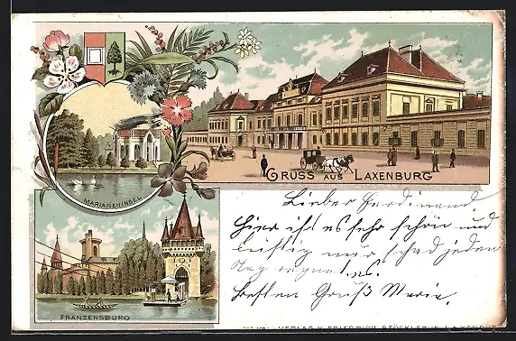 Lithographie Laxenburg, Blauer Hof, Marianeninsel, Franzenburg