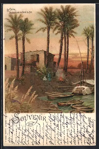 Lithographie Le Caire, Dhahabiyes au bord du Nil