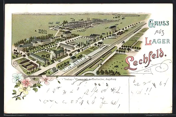 Lithographie Lechfeld, Totalansicht aus der Vogelschau