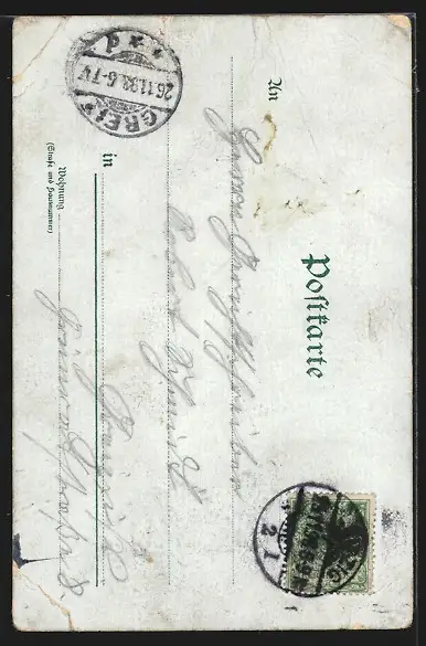gelaufen 1898, Eckknicke links u. rechts, minimale Einrisse re., Stempelspur, guter Zustand