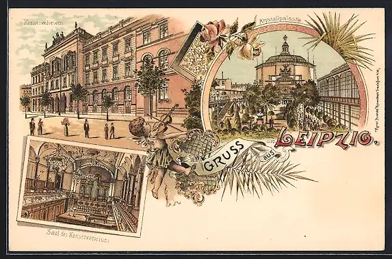 Lithographie Leipzig, Kystallpalast, Konservatorium, Inneres Saal des Konservatorium, Neujahrsgruss