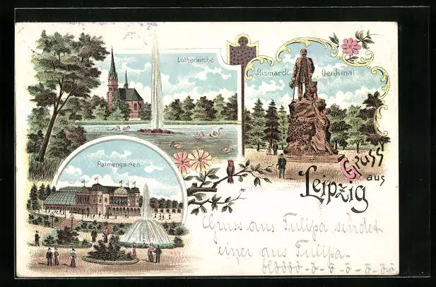 Lithographie Leipzig, Lutherkirche, Palmengarten, Bismarck-Denkmal