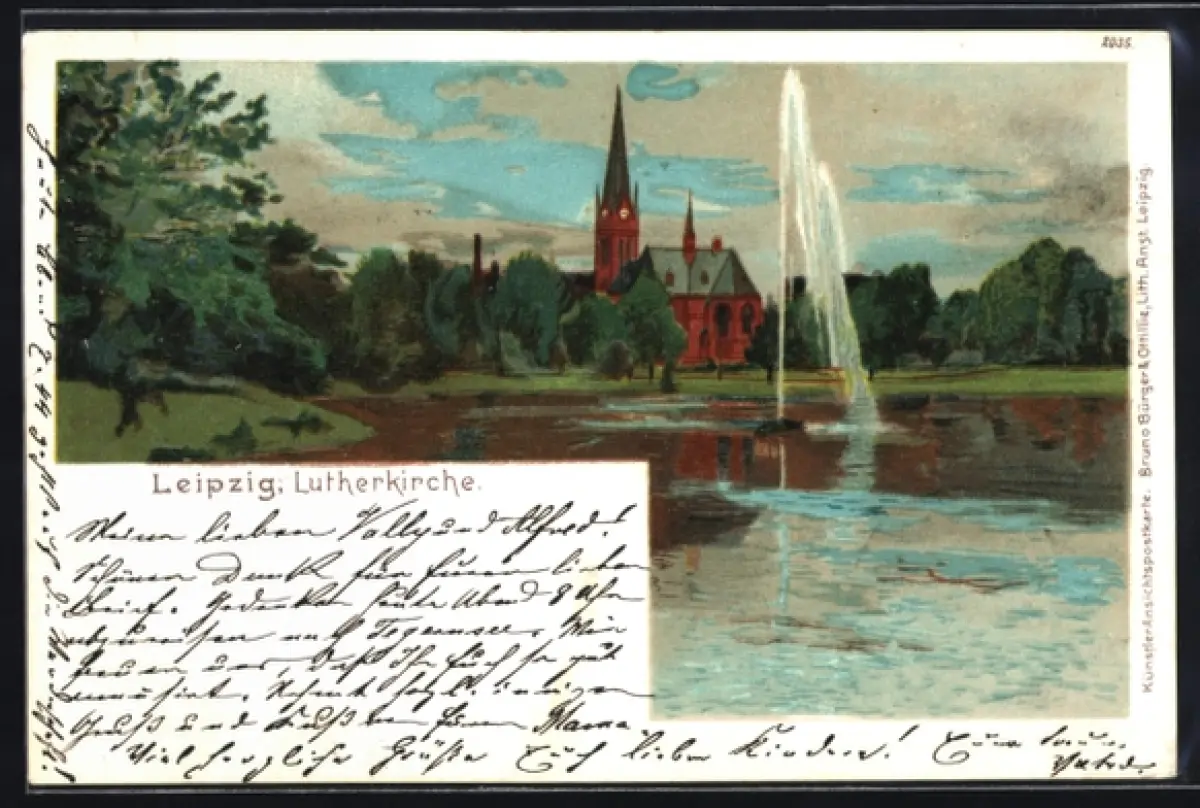 Lithographie Leipzig, Lutherkirche, Teich mit Springbrunnen