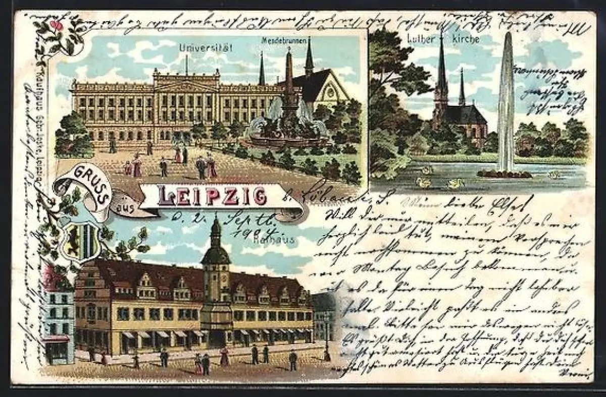 Lithographie Leipzig, Rathaus, Universität, Mendebrunnen, Lutherkirche