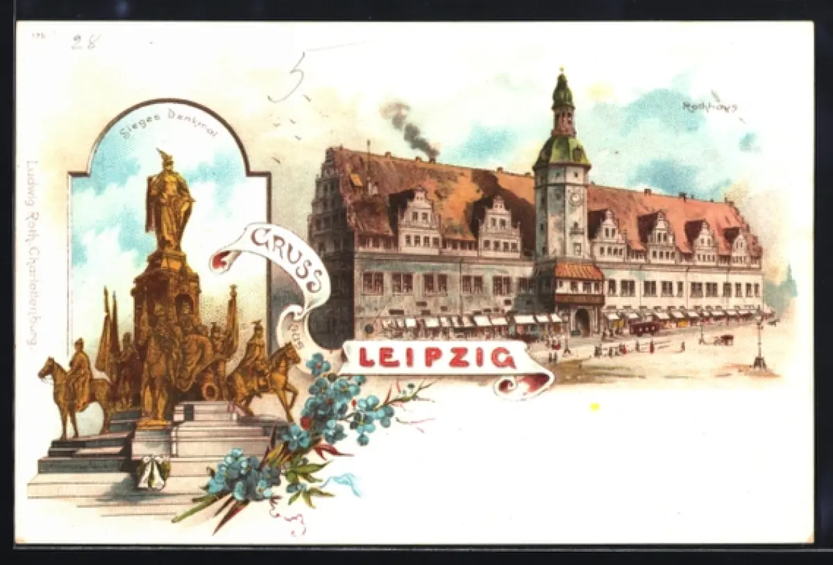 Lithographie Leipzig, Rathaus u. Sieges-Denkmal