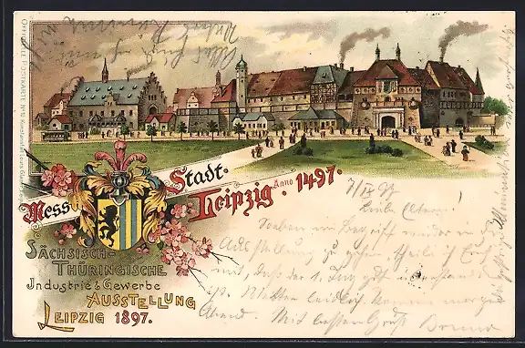 Lithographie Leipzig, Sächsisch-Thüringische Industrie- u. Gewerbe-Ausstellung 1897, Ortsansicht Anno 1497