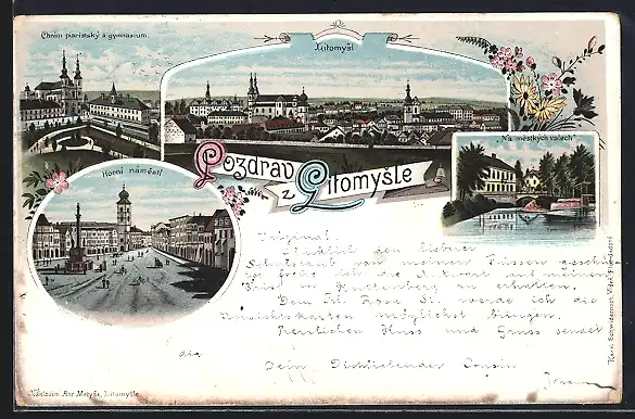 Lithographie Leitomischl / Litomysl, Chrám piaristsky a gymnasium, Horni námesti, na mestkych valech