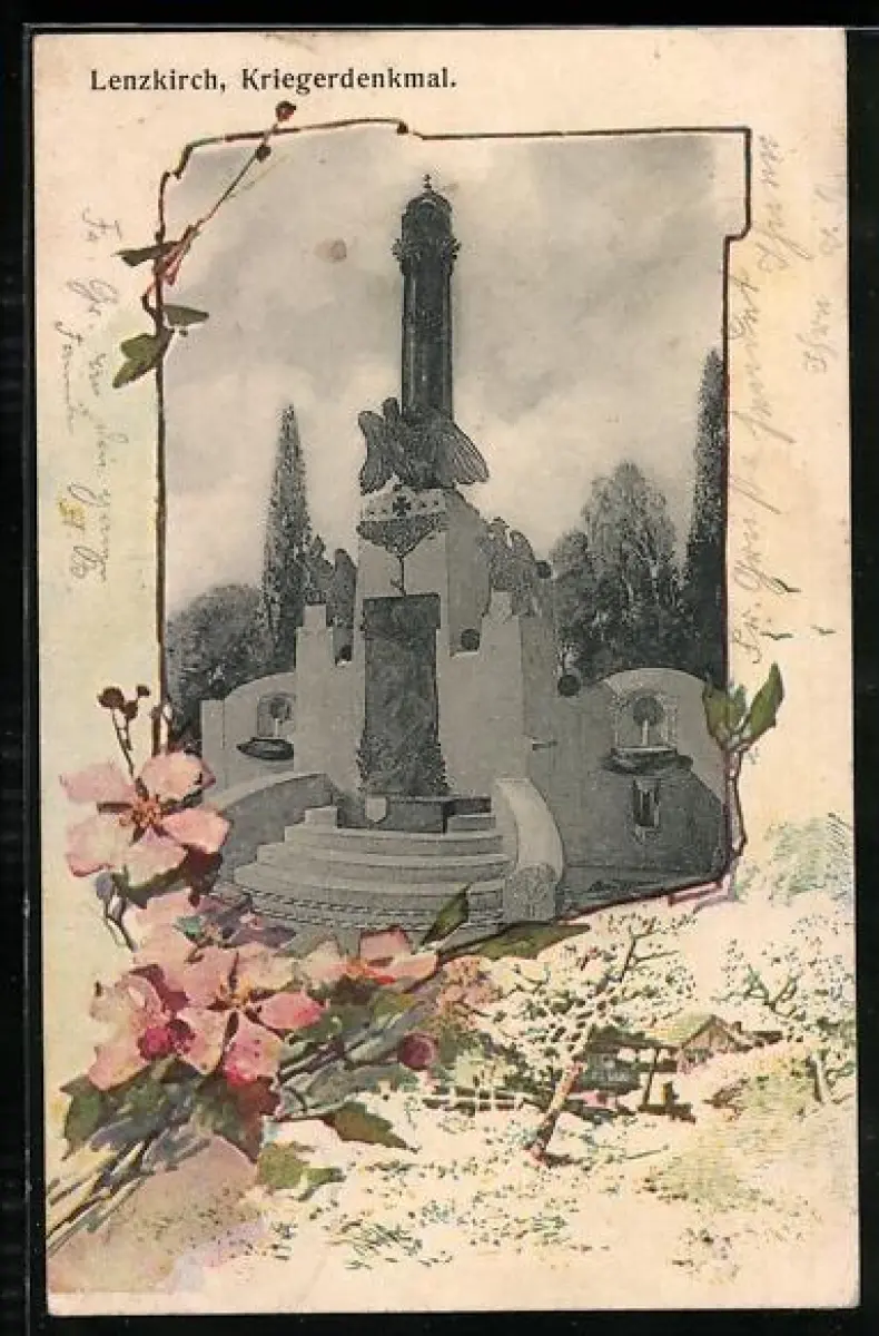 Lithographie Lenzkirch, Kriegerdenkmal, Sommerliche Landschaft, Passepartout