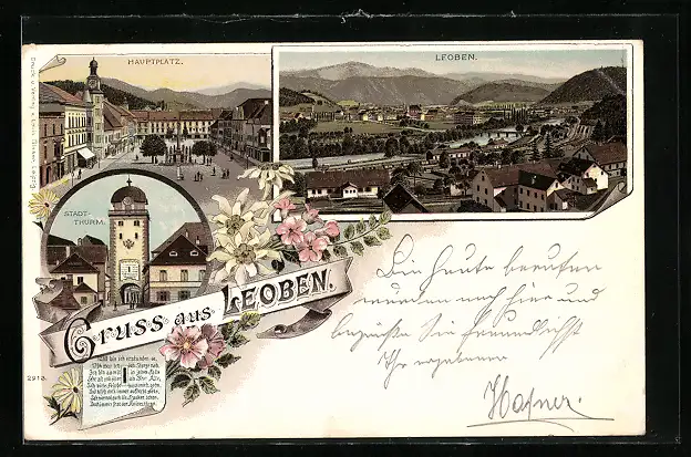 Lithographie Leoben, Hauptplatz mit Denkmal, Stadtthurm, Ortsansicht
