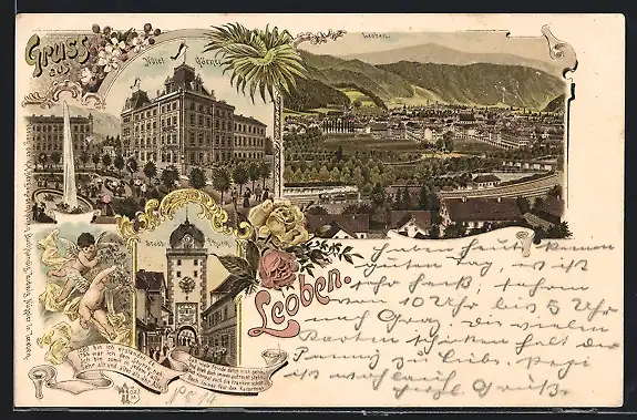 Lithographie Leoben, Hotel Gärner, Stadtturm, Panorama