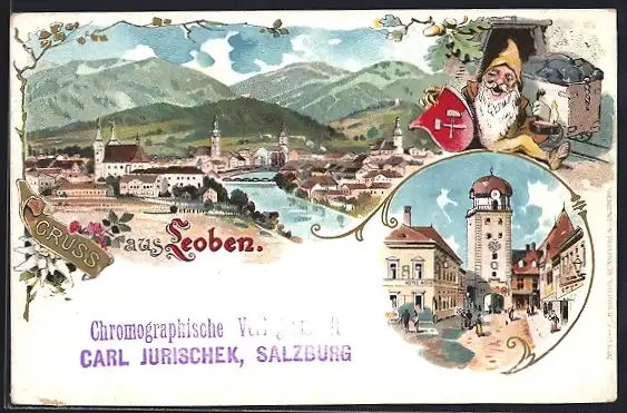 Lithographie Leoben, Ortsansicht, Ortspartie und Zwerg als Bergmann