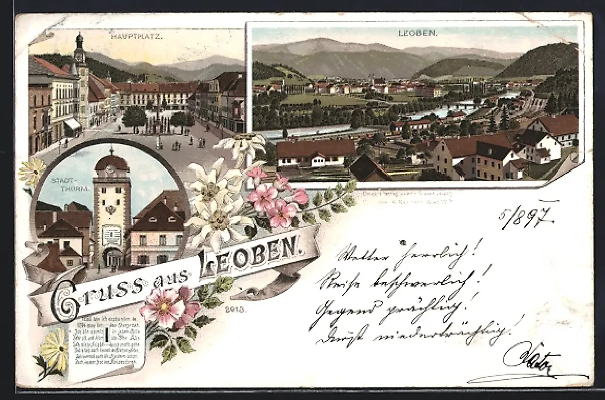Lithographie Leoben, Totalansicht, Hauptplatz, Stadtthurm