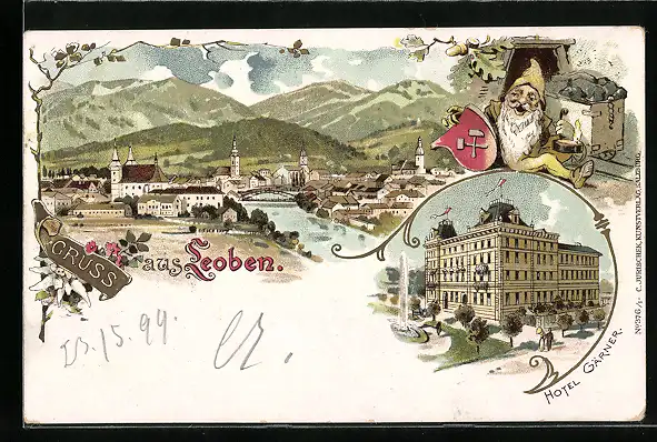 Lithographie Leoben, Totalansicht, Hotel Gärner, Zwerg
