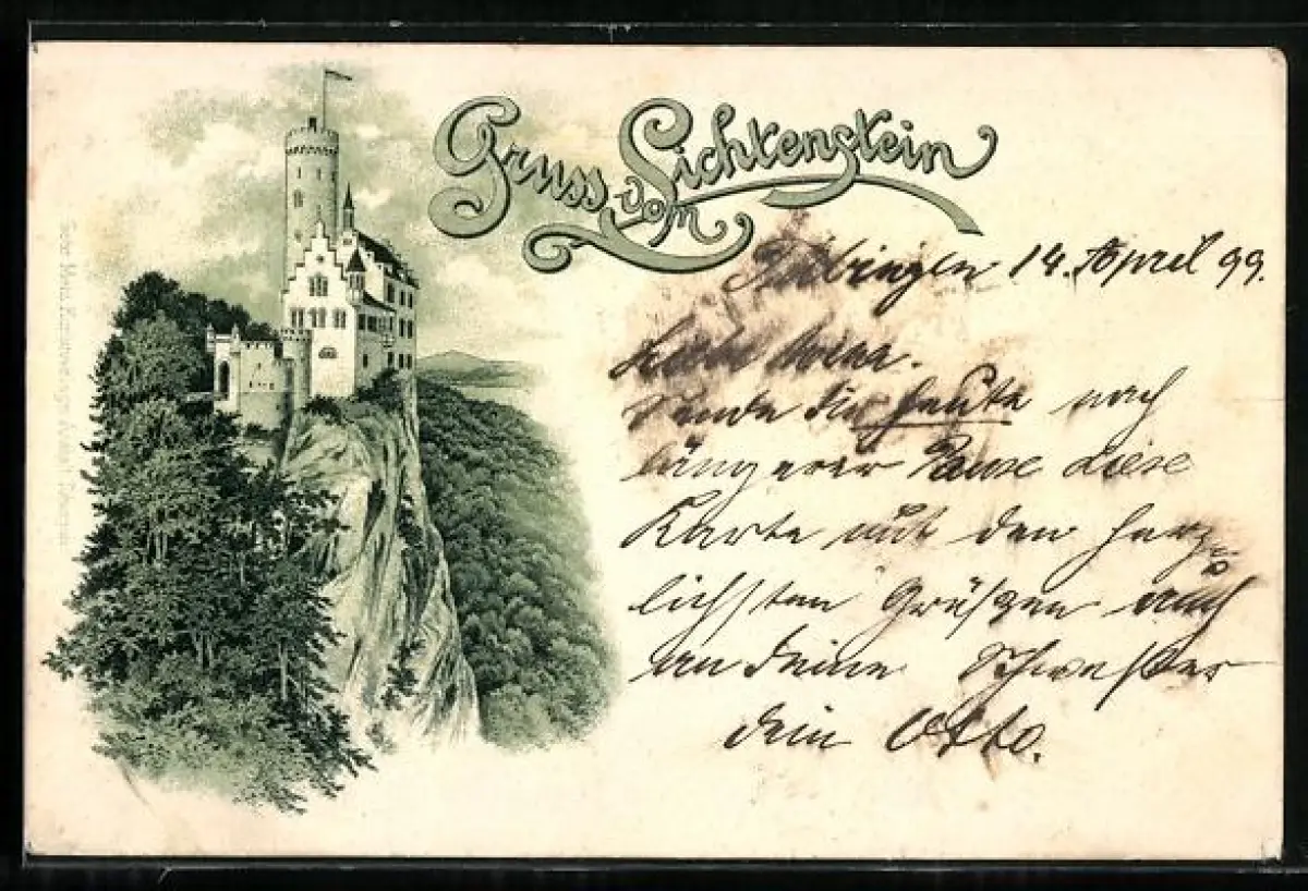 Lithographie Lichtenstein, Schloss mit umgebendem Tal