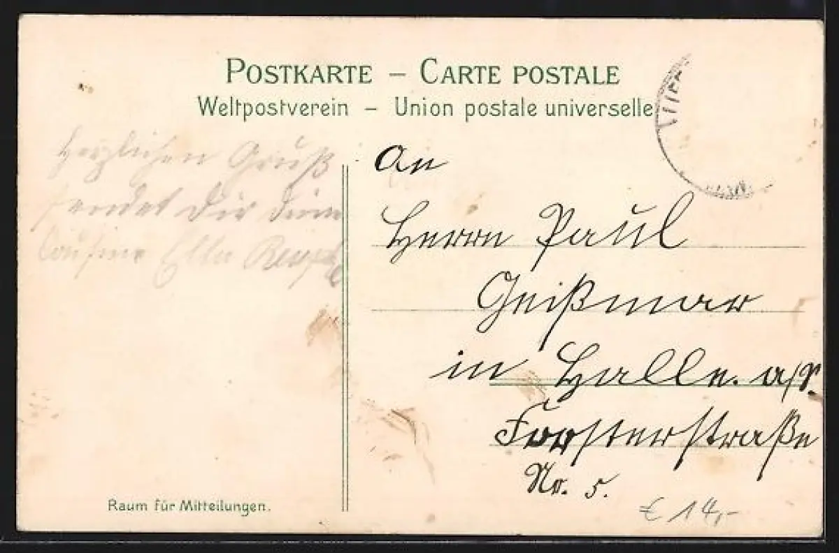 Personenbezogene Daten auf der Rückseite der Karte wurden durch blauen Textmarker unkenntlich gemacht. Die blauen Stellen sind auf die Vorderseite durchgeweicht und wirken sich negativ auf das Postkartenfoto aus