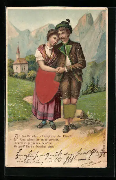 Lithographie Liebespaar in Tracht vor Bergkulisse mit Kirche
