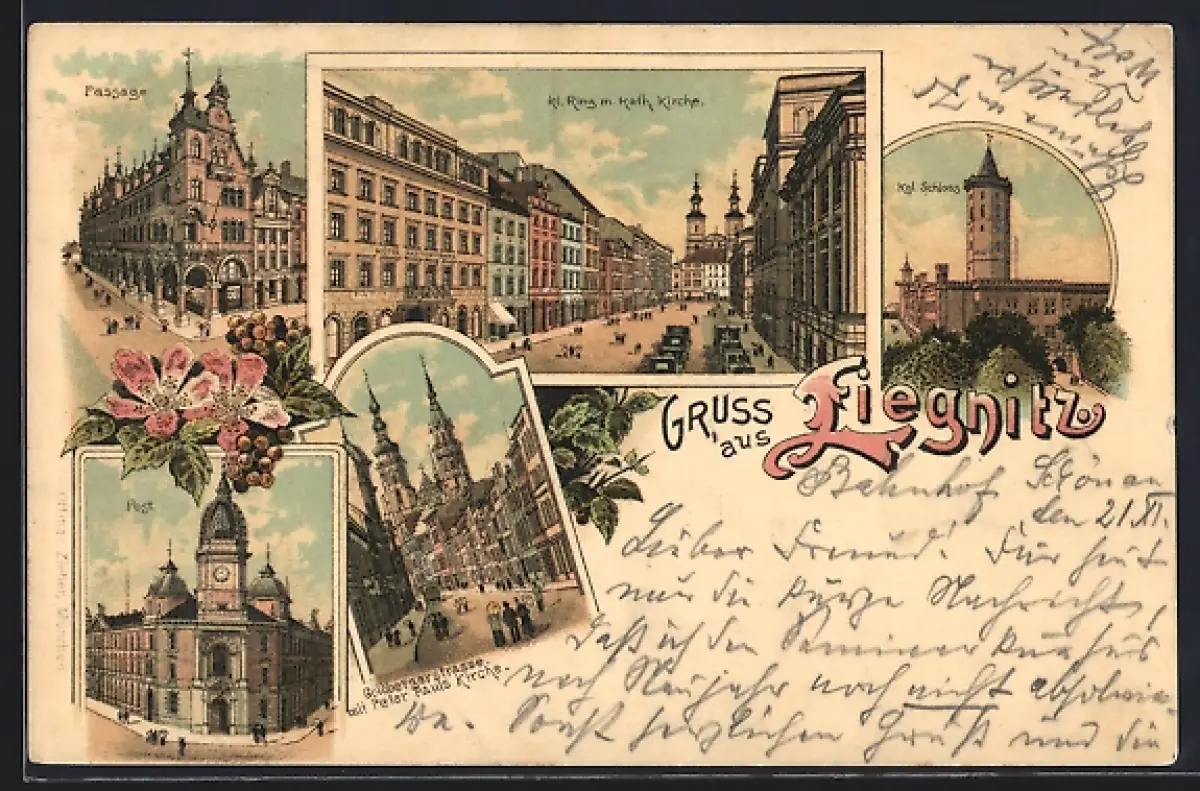 Lithographie Liegnitz, Kl. Ring mit katholischer Kirche, Passage, Post