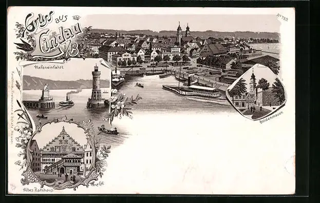 Lithographie Lindau /Bodensee, Heidenmauer, Altes Rathaus