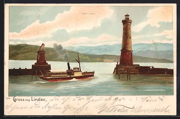 Lithographie Lindau / Bodensee, Sicht auf die Hafeneinfahrt