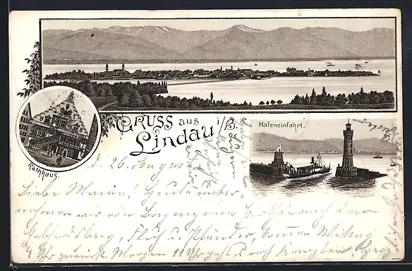 Lithographie Lindau i. B., Teilansicht, Rathaus, Hafeneinfahrt