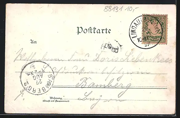 Personenbezogene Daten auf der Rückseite der Karte wurden durch blauen Textmarker unkenntlich gemacht. Die blauen Stellen sind auf die Vorderseite durchgeweicht und wirken sich negativ auf das Postkartenfoto aus