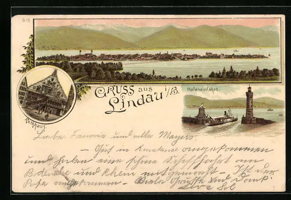 Lithographie Lindau i. B., Teilansicht, Rathaus, Hafeneinfahrt mit Leuchtturm und Dampfer