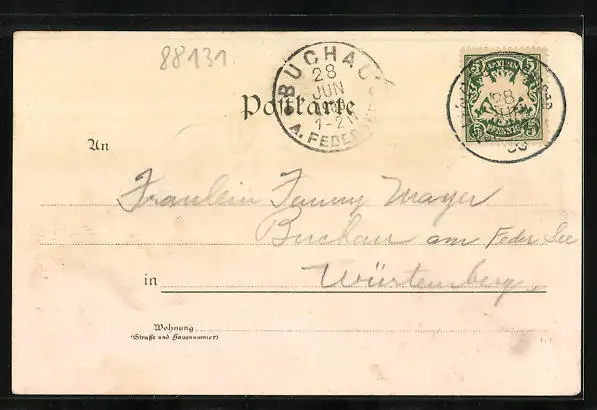Personenbezogene Daten auf der Rückseite der Karte wurden durch blauen Textmarker unkenntlich gemacht. Die blauen Stellen sind auf die Vorderseite durchgeweicht und wirken sich negativ auf das Postkartenfoto aus