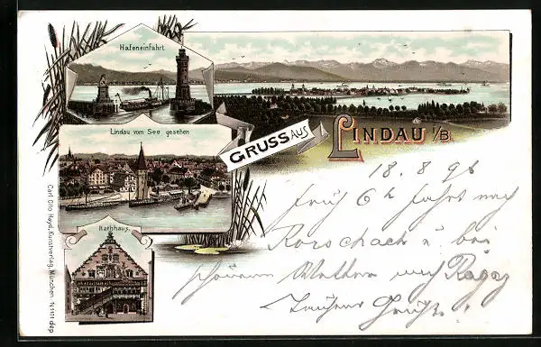 Lithographie Lindau i. B., Teilansicht vom See gesehen, Hafeneinfahrt, Rathaus