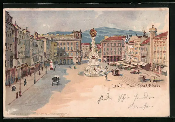 Lithographie Linz, Franz Josef-Platz mit Denkmal und Strassenbahn