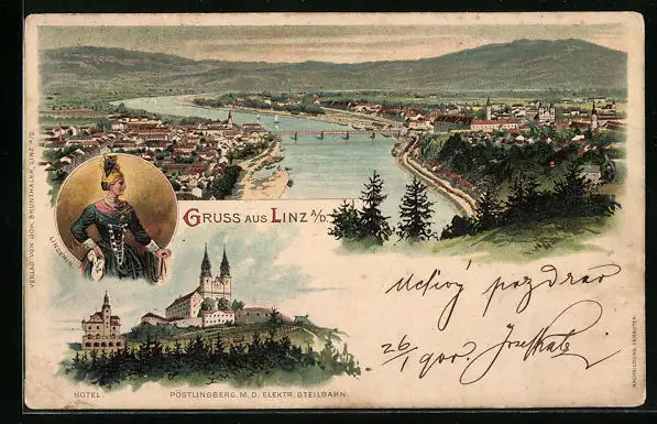 Lithographie Linz a. D., Pöstlingberg m. d. elektrischen Steilbahn u. Hotel, Linzerin, Teilansicht