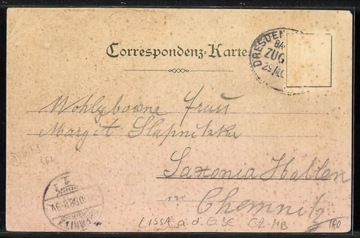 Personenbezogene Daten auf der Rückseite der Karte wurden durch blauen Textmarker unkenntlich gemacht. Die blauen Stellen sind auf die Vorderseite durchgeweicht und wirken sich negativ auf das Postkartenfoto aus