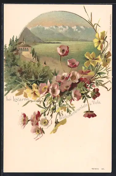 Lithographie Locarno, Gebirgspanorama, Gletscherranunkeln und Viola
