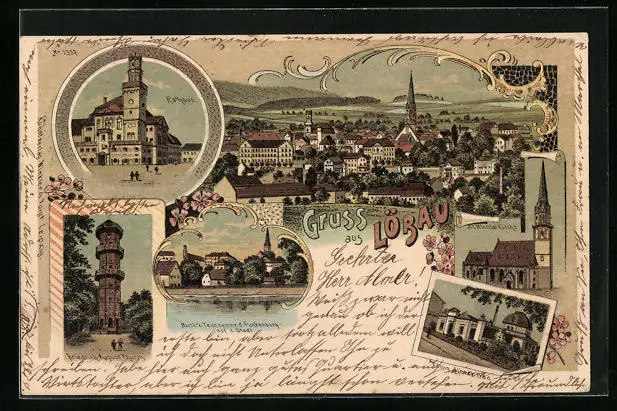 Lithographie Löbau, Ortsansicht mit Kirche und Rathaus