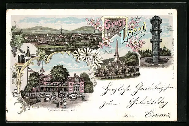 Lithographie Löbau, Ortsansicht mit Kirche und Sieges-Denkmal