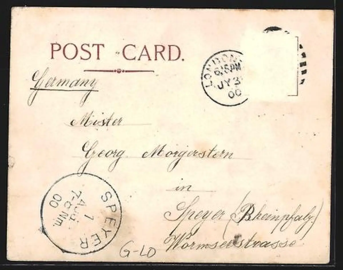 gelaufen 1900, Briefmarke entfernt, Stempelspur, Eckknick oben re., rückseitig Oberflächenschaden, guter Zustand