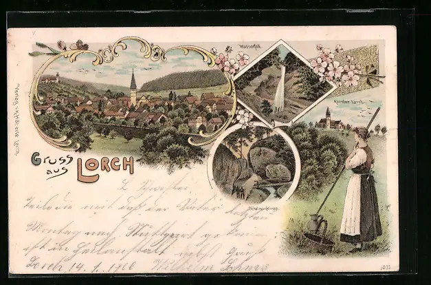 Lithographie Lorch, Ortsansicht aus der Vogelschau, Wasserfall, Bäuerin in Tracht
